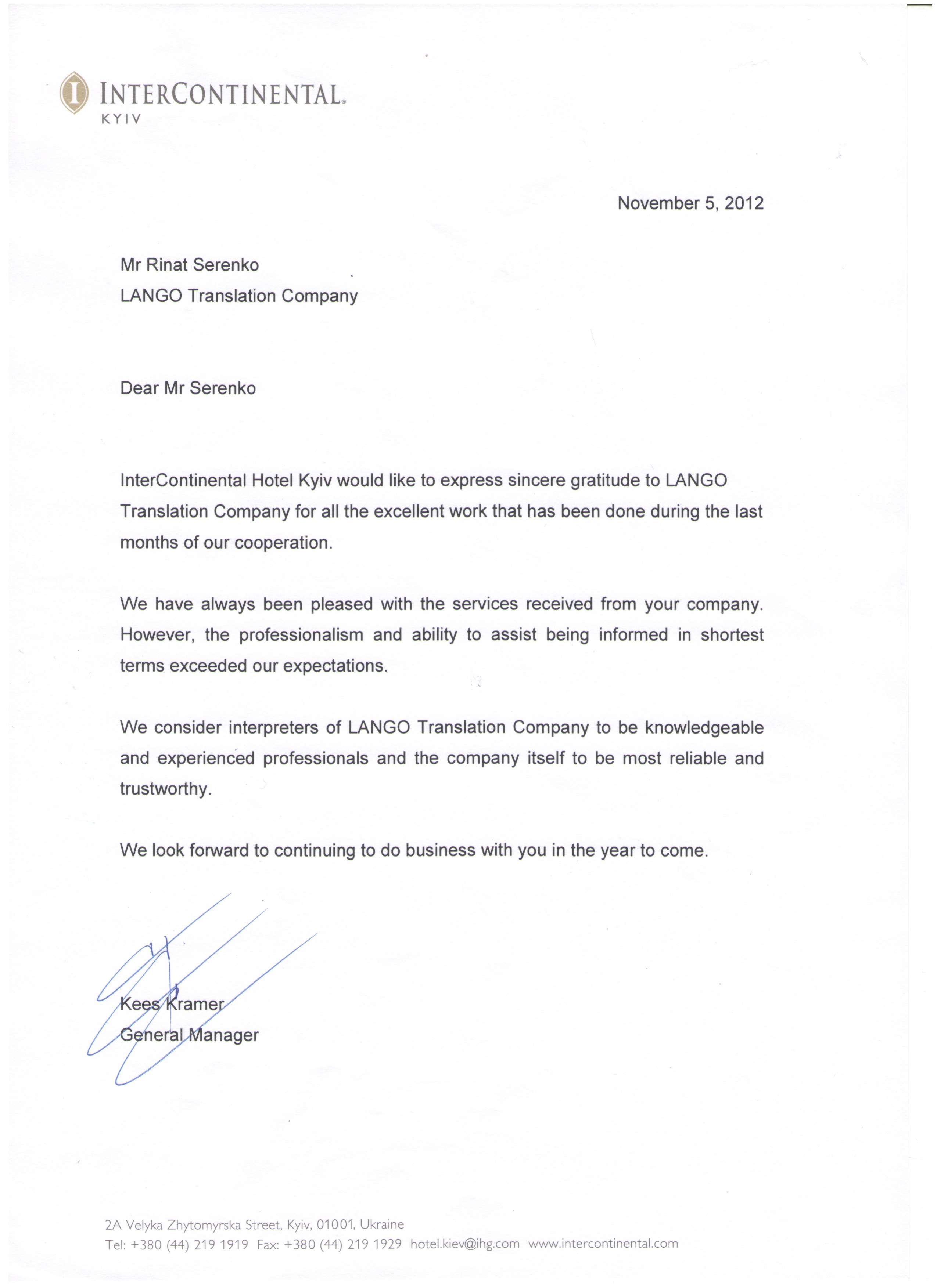 Получить такое письмо — чрезмерное удовольствие! А понимать, что наша работа и старания приносят пользу — еще больше! Команда бюро переводов «LANGO» искренне благодарит сотрудников отеля «InterContinental Kiev» за выбор и доверие. Для нас честь работать с Вами!